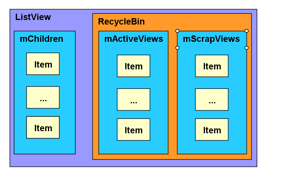 RecycleBin ListView 能够实现成百上千条数据都不会出现 OOM ,最重要的一个原因就是 RecycleBin 机制,它是 AsbListView 的一个内部类,GridView 和 ListView 都可以使用它。